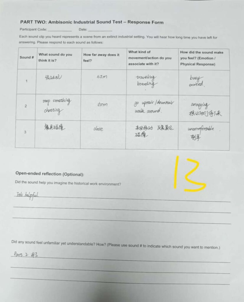 This marked difference strongly supports the hypothesis that the Sound Practice toolkit functioned effectively as a cognitive scaffold. An experimental group participant from Group 6 explicitly reported feeling more sensitive to sonic details (such as frequency ranges) after the practice. Crucially, this heightened sensitivity wasn’t merely analytical; it also fostered empathy, allowing her to connect the harsh industrial sounds experienced in the AR section to the potential lived reality of the workers (Practice 6). This suggests the toolkit initiated or enhanced what I term Affective Synthesis from the audience’s perspective: the cognitive and emotional process where listeners stitch together decoded sonic elements, personal memories (both direct and indirect), cultural associations, and emotional responses into a coherent and meaningful experience instead of a factual replication. The Sound Practice seemingly equipped participants with better tools not just to hear and, but also introductory knowledge for them to understand industrial sounds better and to listen deeply and synthesise meaning more effectively and efficiently.