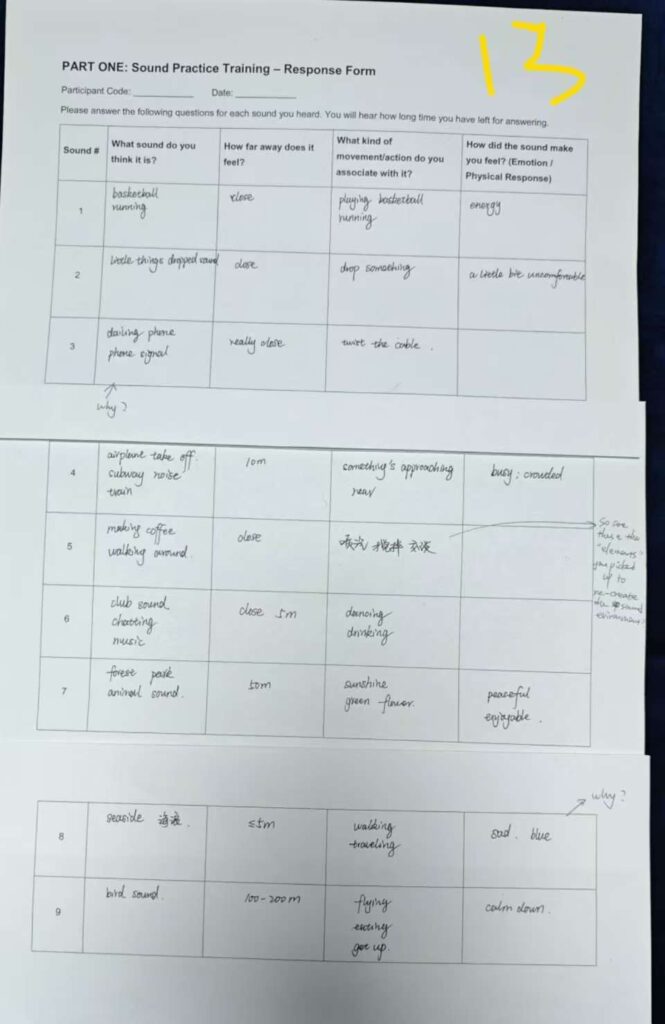 Instruction: In this phase, after listening to each sound, participants are asked to briefly write down: (1) What do you think this is? (2) What specific sonic cues (e.g., echo, rhythm, pitch) led you to that conclusion?