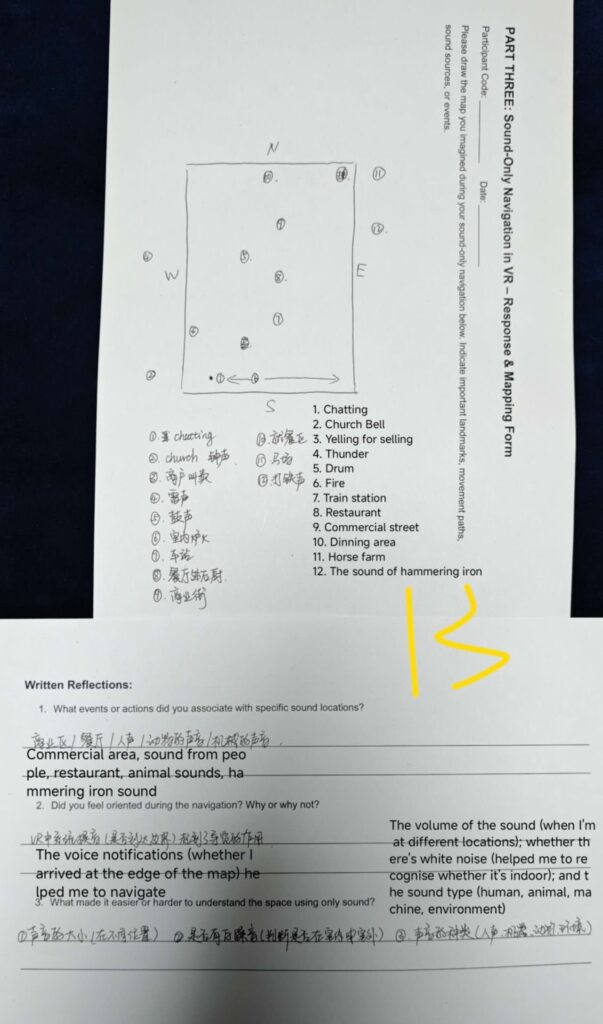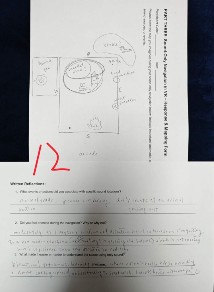 Aside from this, the VR navigation task itself provided rich data on Sonic Wanderability. The VR shows the capacity of sound for self-directed exploration and meaning-making within a sound-dominant environment. When participants are liberated from overwhelming or misleading visual cues (like the Omnideck scenario, mentioned in Group 1), most of them demonstrated interestingly active exploratory strategies. Some of them adopted systematic methods, using a “Roomba” scanning pattern (Groups 5, 6) using my voice notification (at the edge of the map, they can hear my voice saying “you have reached the [compass direction] of the map”) to cover every corner of the map to ensure no detail was missed. Others employed a more curiosity-driven approach, navigating towards intriguing sounds like the bell (Group 6) and using prominent sonic events (like the market chatter) as landmarks or central reference points (Groups 3, 6, 2). Surprisingly, one participant (Group 5) described navigating partially through tactile memory (“how long I pressed the key”), indicating that Sonic Wanderability can be an embodied, multi-sensory process even without dominant visuals.