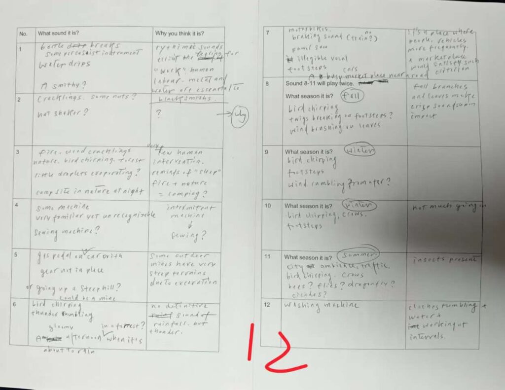 After they observed individual sound elements, they appeared to filter this input, focusing on distinct, salient, or sometimes contradictory elements. For instance, in Group 1, the co-presence of “metal working” (打铁) and “dripping water” (水声) was marked as “strange” (奇怪的地方), prompting further investigation. Similarly, participants noted specific animal calls (Group 1’s crow/geese, Group 3’s sheep/dogs), distinct human actions like “breaking a box” (Group 8, Speeker A), or the unique quality of a sound, like the AI industrial noise being perceived as less clear but more authentic (Group 5). Furthermore, they started matching the sound with memories in a very short time (I only left them one minute to write the interpretation of each sound, but none of the participants asked for extra time, and all finished writing before time ended), and a list of answers showed how they interpreted sounds during listening (see an example of one answer sheet below). This list of answers under one sound shows that the Observation – Marking Unusuals – Matching Memories – Interpretation process is repeated and self-corrected. It became certain until it cannot be corrected anymore.